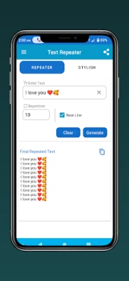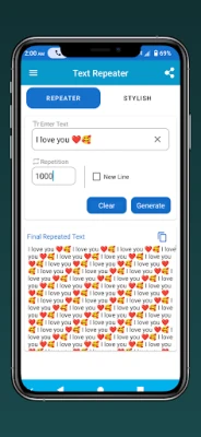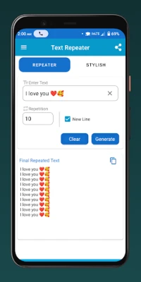 Text Repeater is the ultimate app for anyone who wants to repeat text effortlessly, up to 10,000 times! Whether you’re looking to create playful text patterns, send repeated messages, or save time on typing, Text Repeater makes it quick and easy.